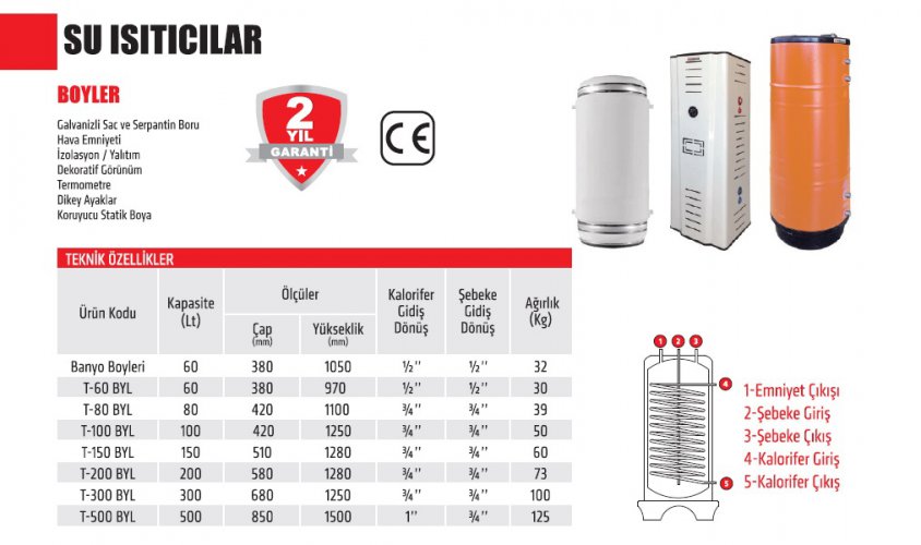 Ürünlerimizin tamamı temiz, sıcak kullanım suyu elde etmek amacı ile tasarlanmıştır. Boylerler; kazan içerisinde bulunan sıcak suyun temiz su haznesi etrafında dolaşması ile çalışmakta olup minimum kapasiteli ürünümüz 60 Litre su depolayabilmektedir. Sıcak suyu kullanmadığınız zamanlarda depolamış olduğu suyu kalorifer kazanı vasıtası ile ısıtmakta ve siz kullanacağınız zaman hazneden tedarik ederek bekleme süresini de ortadan kaldırmış olmaktadır. Kalorifer kazanının çalışmadığı zamanlarda; sıcak su elde etmek istenir ve bu suyun devamı sağlanacak olursa da bu noktada sizlere rezistanslı boylerimiz ile yardımcı olmaktayız. Rezistanslı boylerlerimizde; su deposunun altında bulunan ısıtıcı rezistanslar yardımı ile boylerin fişini prize takarak suyu ısıtabilir ve bu şekilde kullanım suyu elde edebilirsiniz.